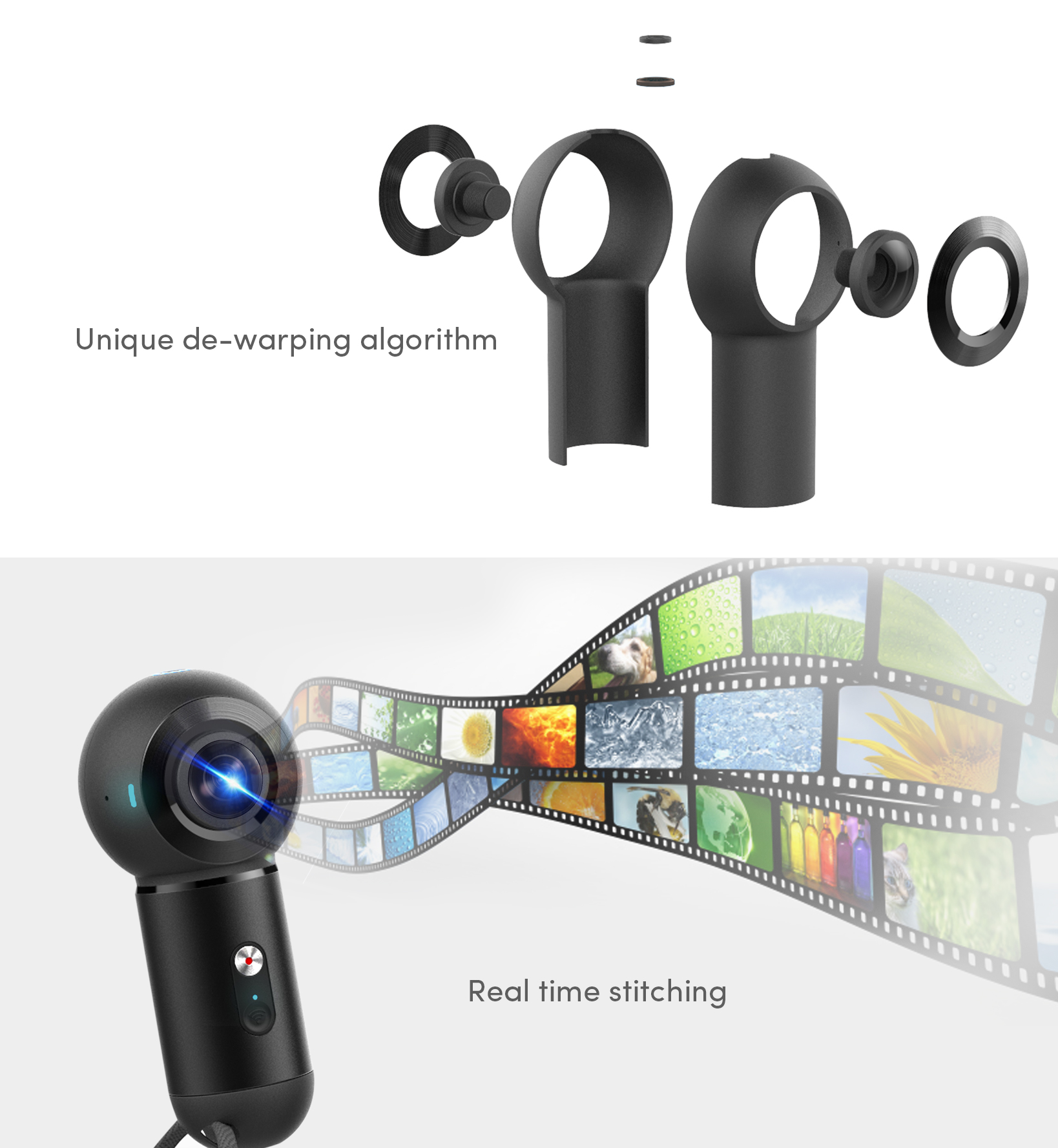 ▪ Two ultra-wide FOV 200° fisheye lenses ▪ Support UHD video up to 4K@30fps ▪ Unique de-warping algorithm ▪ Real time stitching ▪ WIFI connection, smart phoness remote control